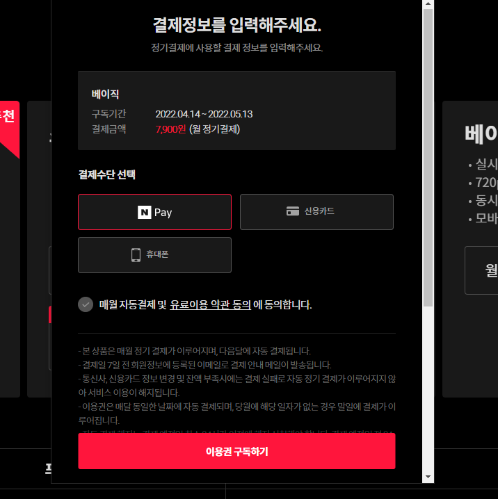 1달 7,900원 이용권 구매 후 해지를 하고 싶다면 바로 해지가 가능합니다. 해지를 하더라도 바로 해지가 되는 것이 아니고 다음달 정기결제가 취소가 되는 방식입니다. 그러므로 해지를 하더라도 다음달 정기결제일 전날까지는 무제한으로 이용가능합니다.