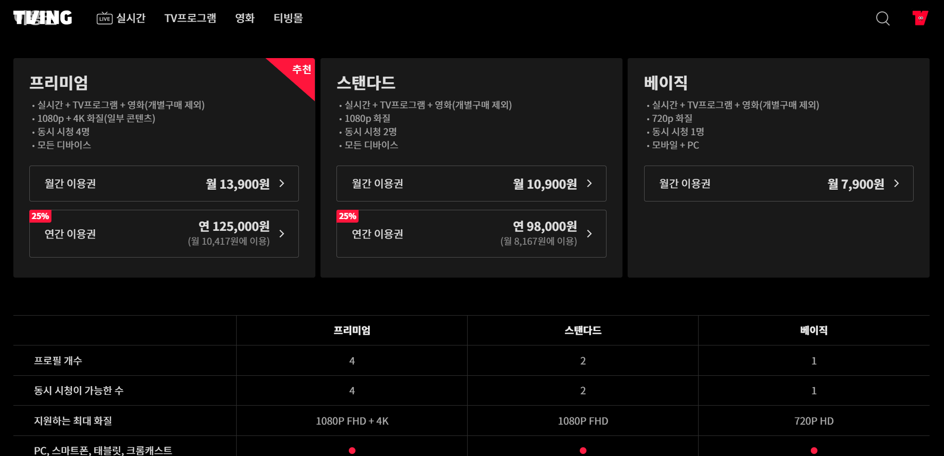 티빙 이용권은 프리미엄, 스탠다드, 베이직이 있습니다.
